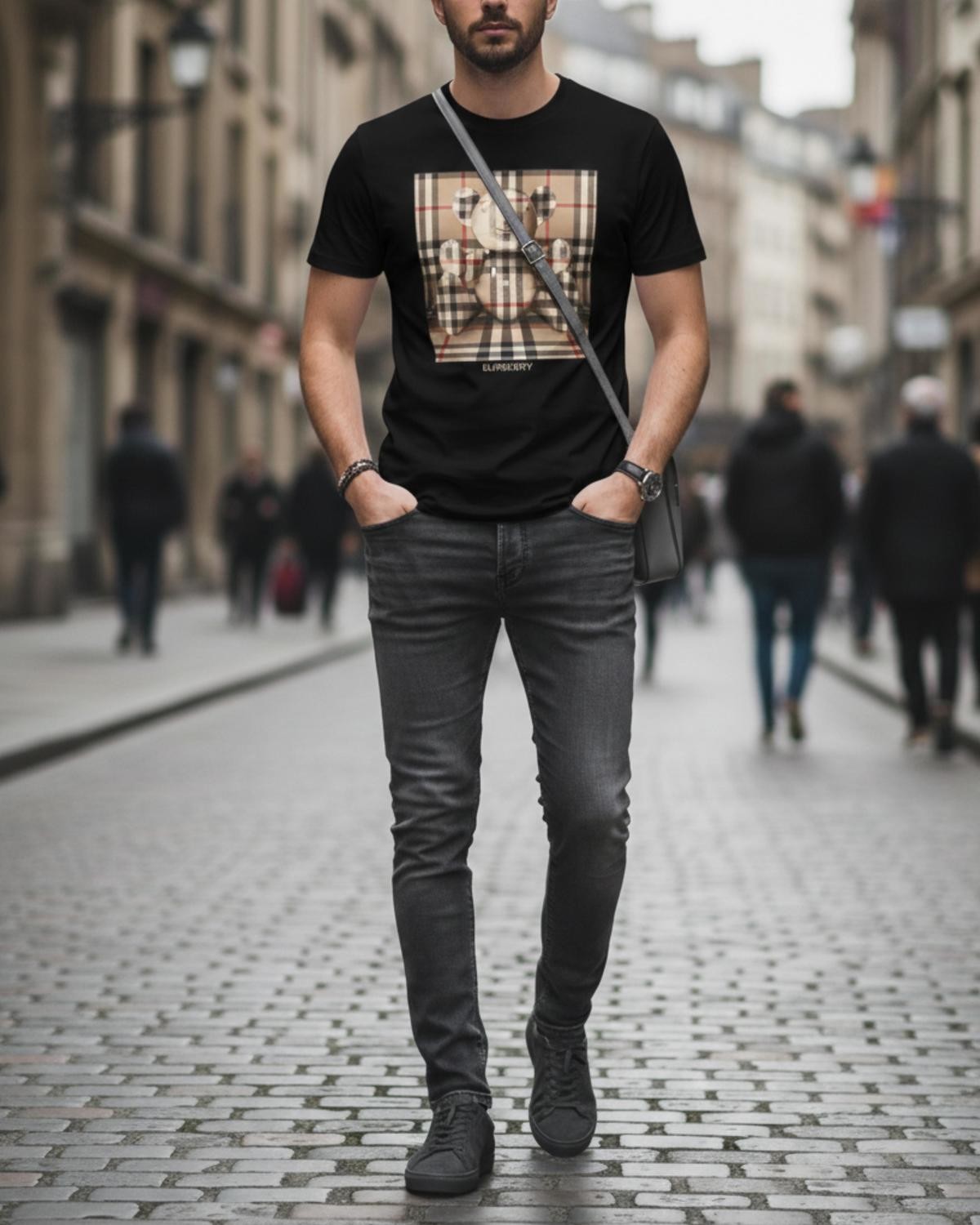 BURBERRY-經典格紋泰迪熊印花棉質T恤 黑