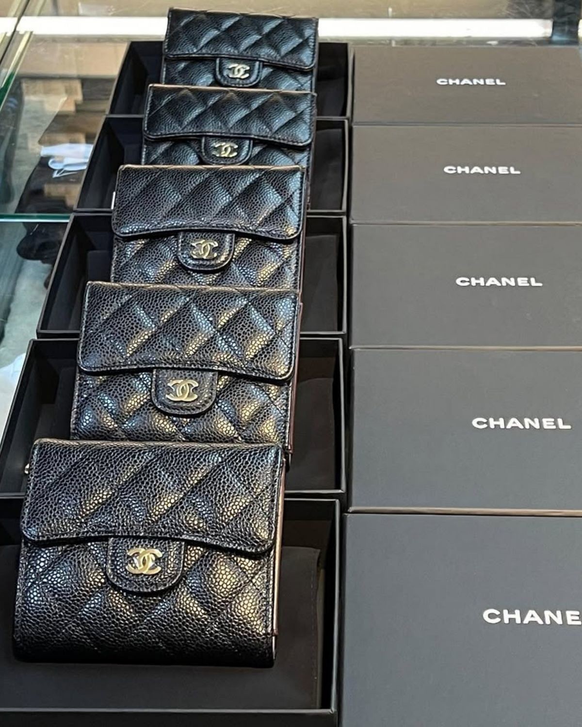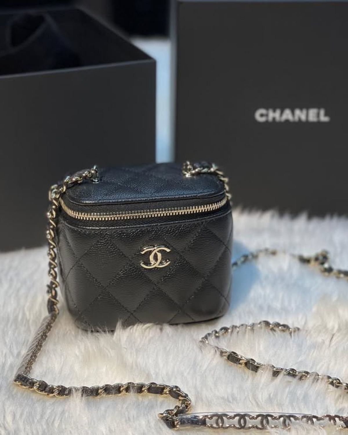 CHANEL-經典雙C LOGO荔枝牛皮黑色迷你化妝盒子(需預購)